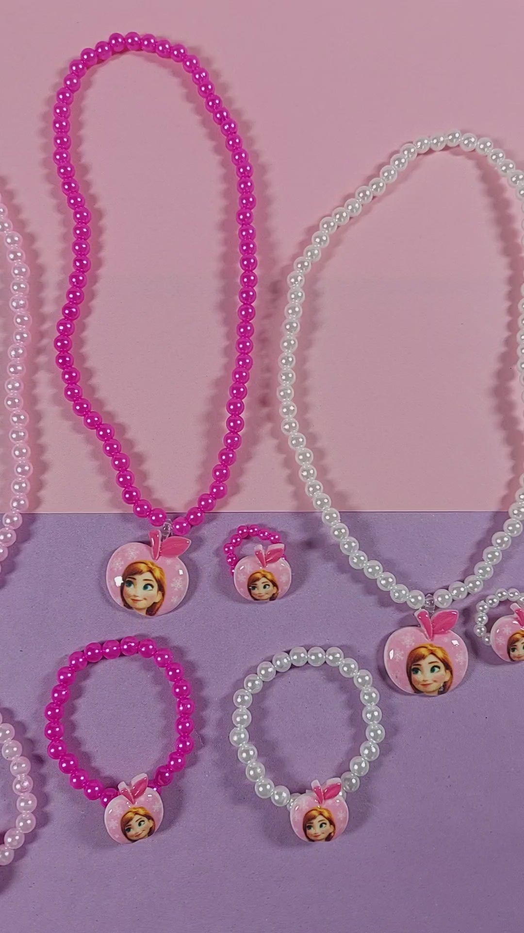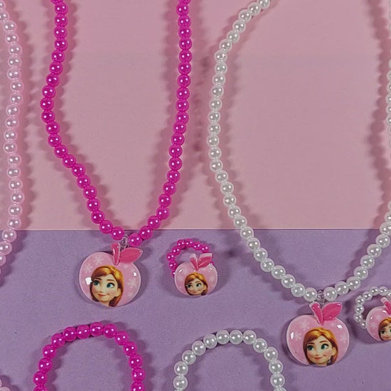 3-piece set includes a colorful beaded pearl necklace, bracelet, and matching ring featuring Anna from Frozen charm. Lightweight, stretchy, and perfect for birthdays, dress-up, or daily sparkle!