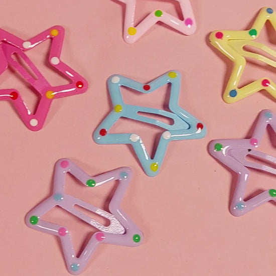Add a pop of pastel and a dash of sparkle with our PolkaStar Snap Clips! This set of 4 Polkadot star-shaped clips is perfect for playful hairstyles, party looks, or everyday charm. Designed for comfort and easy grip, these clips are a must-have in every little fashionista’s accessory box.